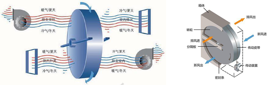 熱排風(fēng)和冷新風(fēng)分別通過蓄熱輪的半圓,輪體同時(shí)不斷旋轉(zhuǎn),將排風(fēng)中的熱量和水分不斷傳遞給新風(fēng)。能量回收效率可高達(dá)70%-90%。