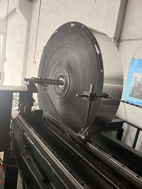 轉(zhuǎn)輪可采用立式纏繞工藝和水平盤繞工藝,立式纏繞工藝優(yōu)于水平盤繞工藝,以一米一直徑轉(zhuǎn)輪為例,可達(dá)到90 圈,而水平盤繞方式由于基材因素同樣纏繞 1 米的輪子可達(dá)到 80 圈。